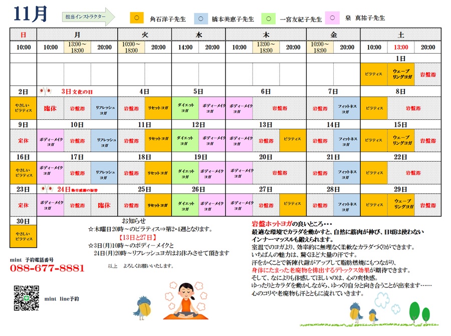 お客様へお知らせ 下記に2025.11月の予定表を追加いたしました。ご確認の上、ご予約下さいますようお願い致します。 当店、2階にて【縦横整体】を行っております。また、新しく【ボディセラピー】を始めました。詳しくは、ボディーケアを開けて下さい。