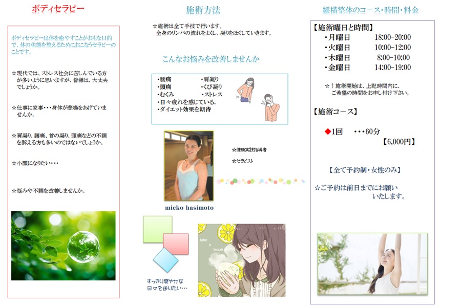 肩凝り・腰痛・膝の痛み・ねん挫・慢性疾患の改善・しびれ・めまい などのお悩みを改善しませんか。